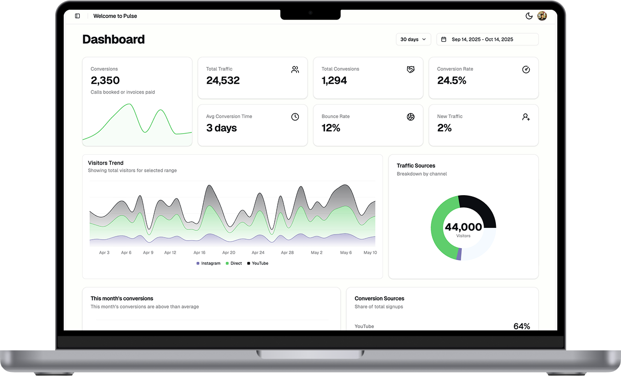 Pulse tracks your customers at every step of your funnel and delivers detailed analytics, regardless of where and when they convert.